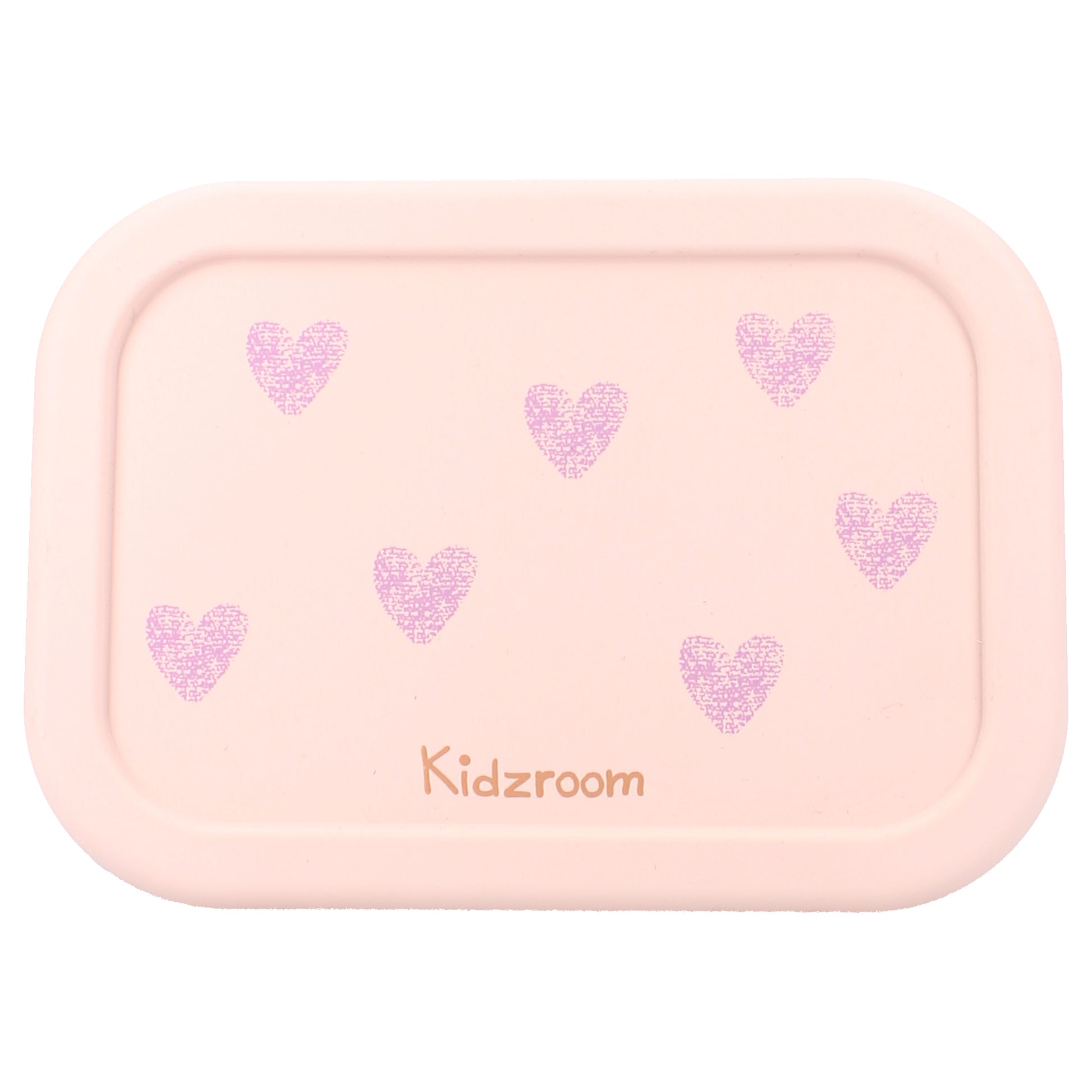 De lunchbox heeft een stijlvolle roze kleur en is versierd met een hartjesprint.