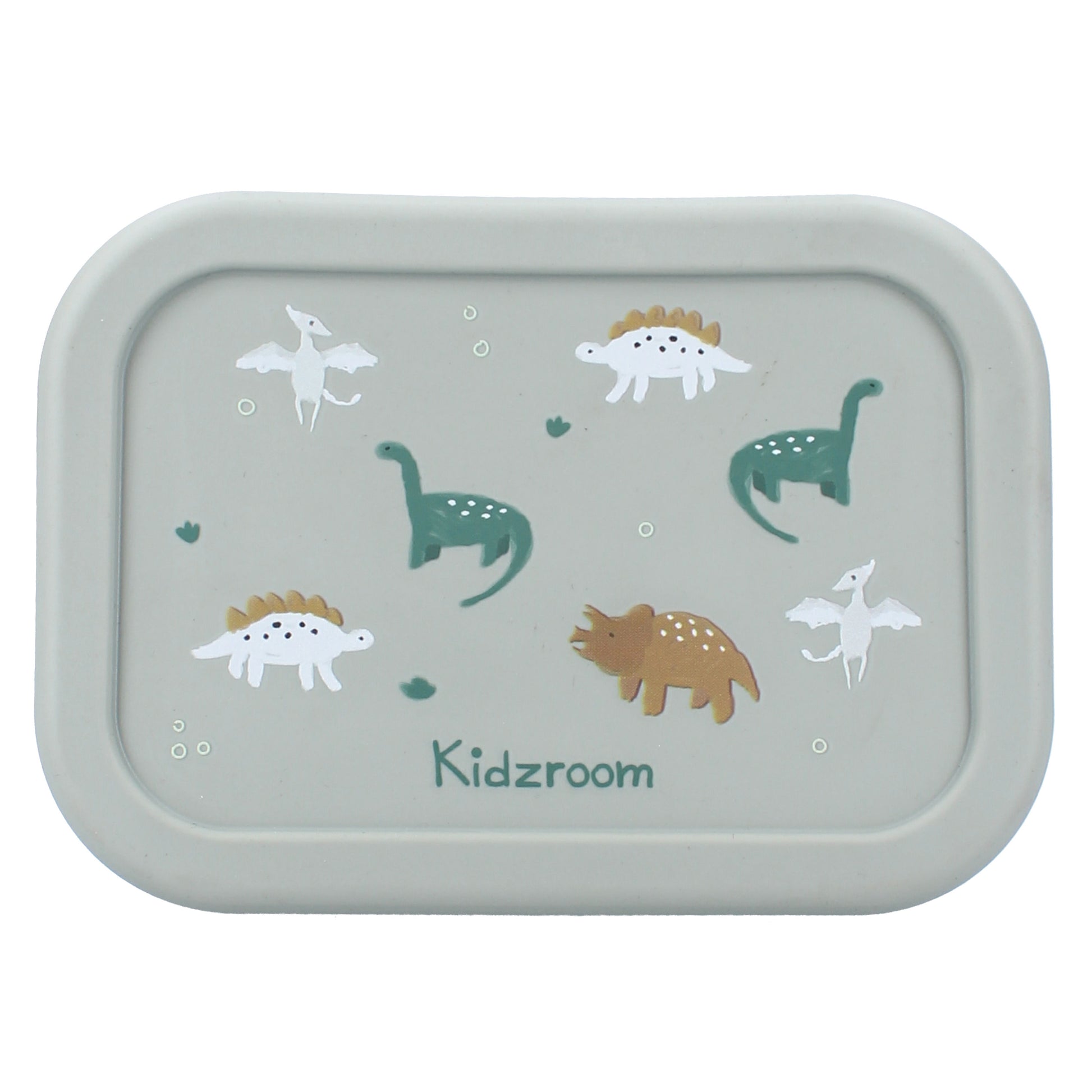 De lunchbox heeft een stijlvolle beige kleur en is versierd met een dino-print.
